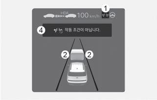 | ① 고속도로 차로변경 보조 표시등 | 초록색 : 작동 가능한 상태 초록색 깜빡임 : 작동 상태 회색 : 대기 상태 흰색 깜빡임 : 취소 상태 (일정 시간만 표시) |