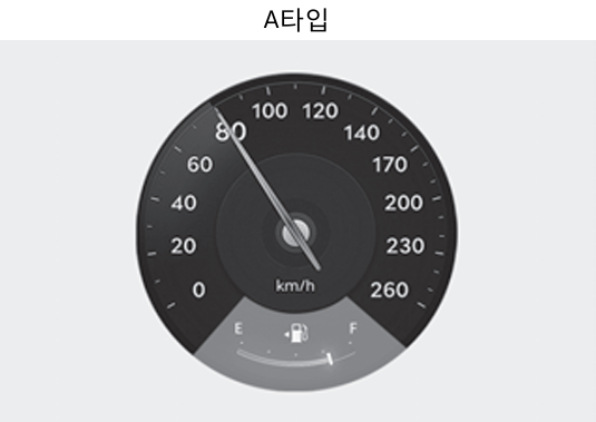 연료계는 클러스터 좌측 하단에서 확인할 수 있습니다. 시동이 켜진 상태에서, 연료 탱크에 남아있는 연료량이 표시됩니다. 연료계의 바늘이 E를 가리키기 전에 연료를 보충하는 것이 좋습니다. 만약 클러스터에 연료 부족 경고등이 켜지면 연료를 신속히 보충해야 합니다. 연료 잔량은 시동이 켜진 상태에서 표시됩니다.