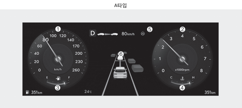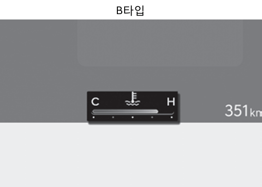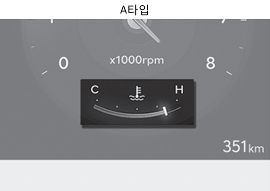 냉각수 수온계는 엔진을 식혀주는 냉각수의 온도를 표시합니다. A 타입 및 B 타입의 클러스터의 우측 하단에서 확인할 수 있습니다. 냉각수 수온계의 표시가 H 범위에 있으면, 엔진 과열의 가능성이 있습니다.
