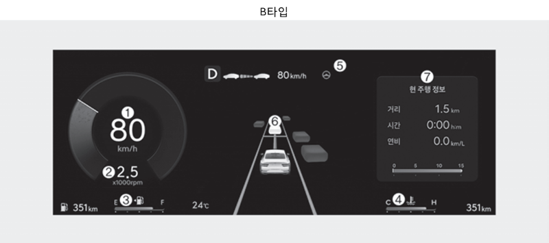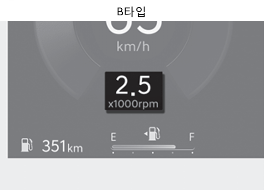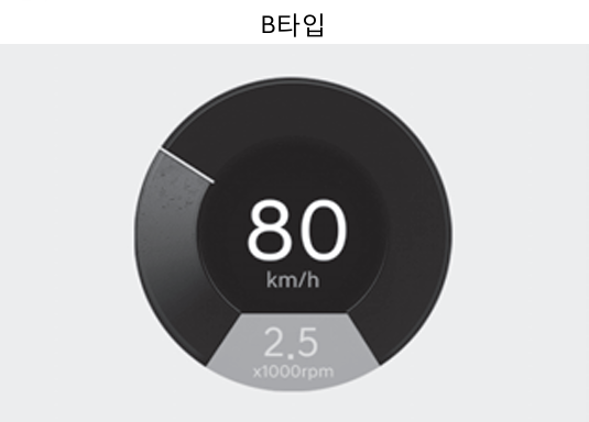 B타입은 왼쪽 편에 속도계와 RPM이 표시됩니다. 오른쪽은 차량 주행 정보 등 다양한 정보가 표시됩니다. B타입을 활용할 경우 가운데 부분과 오른쪽 부분에 표시되는 정보로 차량의 주행 정보 등 다양한 정보를 쉽게 확인할 수 있다는 장점이 있습니다.