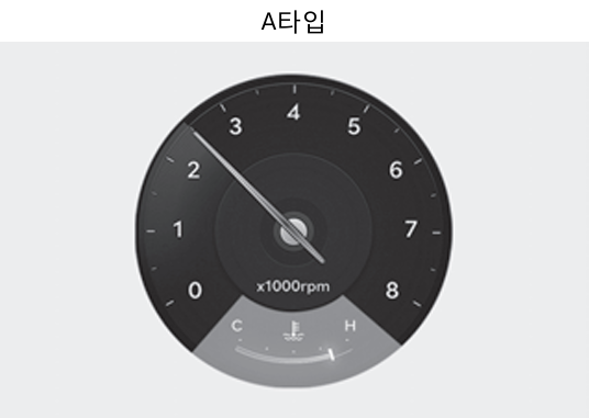 A타입은 바늘로 속도를 표시하여 직관적인 확인이 가능합니다. B타입은 게이지와 가운데 숫자로 속도를 확인할 수 있습니다. 또한 아랫부분에는 RPM이 숫자로 표시됩니다.