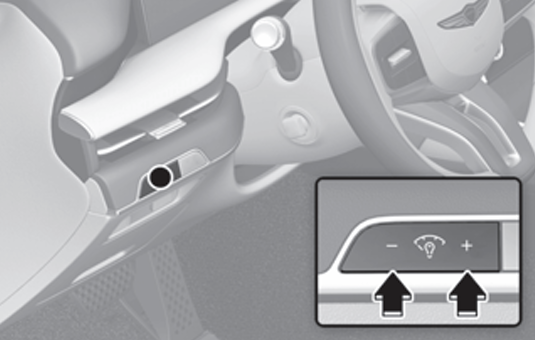 시동이 켜진 상태에서 운전석 좌측 아랫부분에 위치한 조명 조절 스위치를 눌러 클러스터의 밝기를 조절할 수 있습니다. 클러스터 조명을 조절하면 실내 스위치 조명도 함께 조절됩니다.