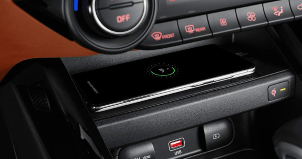 중앙 콘솔 앞쪽에 위치한 무선 충전 시스템으로 차량의 도어를 모두 닫고 시동 스위치를 켠 상태에서 무선 충전이 지원되는 스마트폰을 충전 패드 위에 놓으면 충전이 가능합니다.
