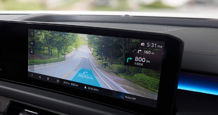 전방 카메라로 촬영한 실제 주행 영상 위에 내비게이션 상의 안내 지점과 진출 방향이 표시되어 운전자가 직관적으로 주행 방향을 파악할 수 있습니다. 또한 여기에 스마트 크루즈 컨트롤 등 다양한 정보가 세심하게 표시됩니다.