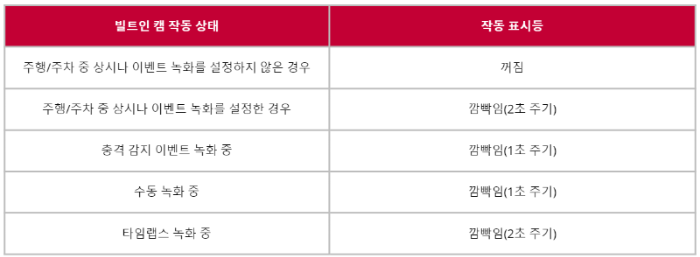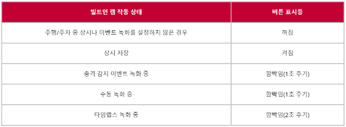 운전자는 운전자 위쪽 LED 램프 부분에 위치한 수동 녹화 버튼이나 전방 및 후방의 카메라 표시등을 통해 빌트인 캠의 작동 상황을 파악할 수 있습니다.