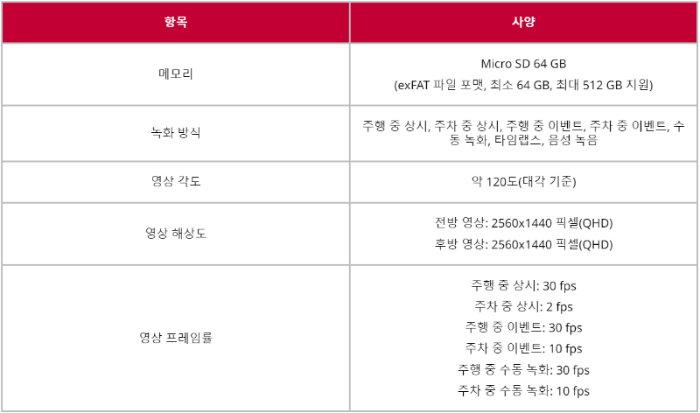 | 적용 기능 | QHD 화질 음성 녹음 O 기아 커넥트 주행 정보 표시 |