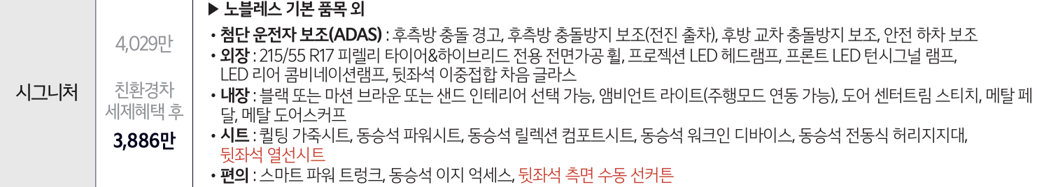시그니처 트림은 뒷좌석 열선시트 및 뒷좌석 측면 수동 선커튼이 기본적으로 적용되며 하이브리드 모델 3,886만 원(친환경차 세제혜택 후), 2.0 가솔린 모델 3,522만 원, 1.6 가솔린 터보 모델은 3,601만 원에 구입 가능합니다.