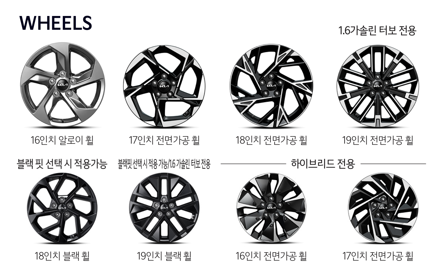 K5 하이브리드, 2.0 가솔린, 1.6 가솔린 터보는 트림별로 적용되는 휠&타이어가 다르며, 휠 & 타이어 옵션인 스타일 옵션도 다른 부분이 있습니다.