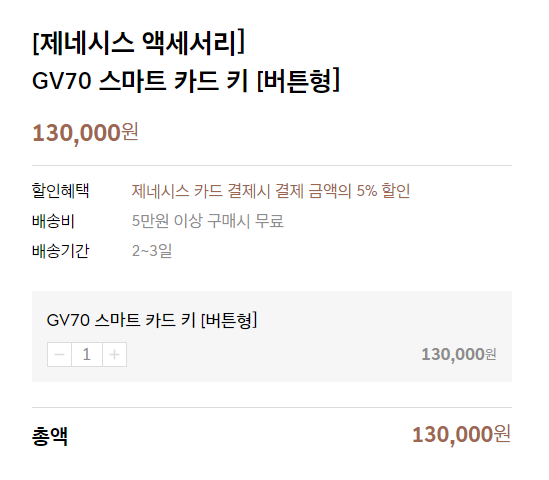 스마트 카드 키는 제네시스 부티크 몰에서 10만 원에 구입 가능합니다. 품절일 경우 입고를 기다려 구매하면 쉽게 구입할 수 있습니다.