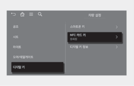 이 상태에서 인포테인먼트 시스템에서 설정 → 차량 → 디지털키 → 카드키 → 카드키 사용 체크 박스에 체크가 되어 있는지 확인합니다.