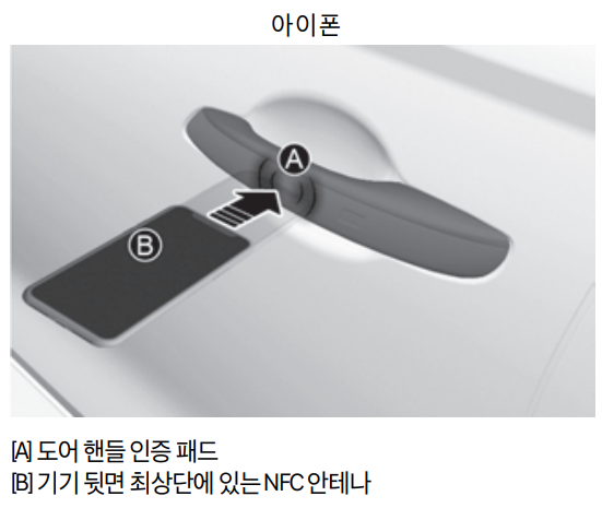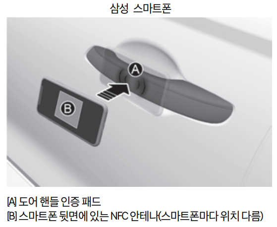 UWB 기능을 지원하지 않는 스마트폰의 경우 등록된 스마트폰의 NFC 안테나를 운전석 또는 동승석 도어 핸들 인증 패드에 2초 이상 접촉하면 도어가 잠금 또는 잠금 해제됩니다.