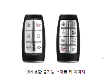 다만, 버튼형 스마트 카드 키는 24년 5월 이후 출시 부분변경 모델에 적용됩니다. 스마트 키가 위 사진과 같은 경우 버튼형 스마트 카드 키를 사용할 수 없습니다.