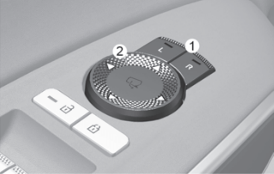 시동 ACC, ON 또는 시동이 걸린 상태에서 L(운전석) 버튼(1) 또는 R(동승석) 버튼(1)을 누른 후 미러 조절 스위치(2) 부분을 눌러 실외 미러를 조절할 수 있습니다.