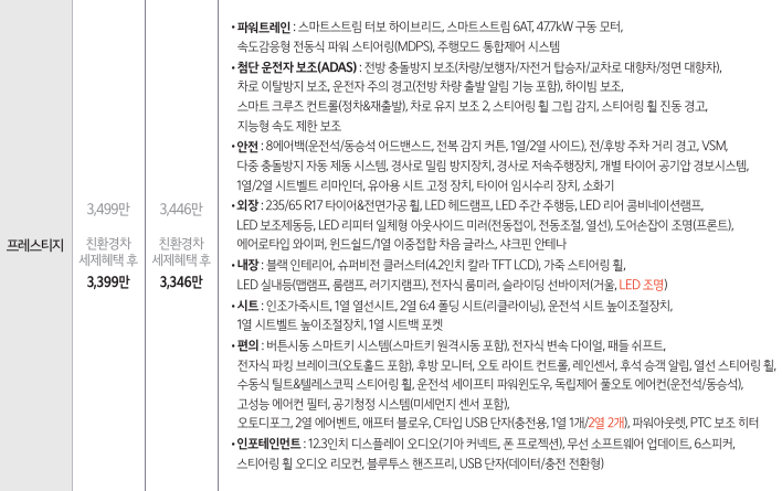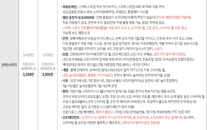 | 프레스티지 | 2,836만 원 | 2,927만 원 | 3,346만 원 |