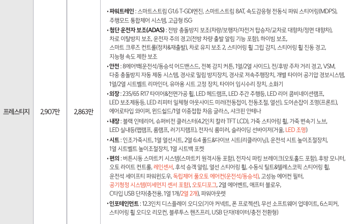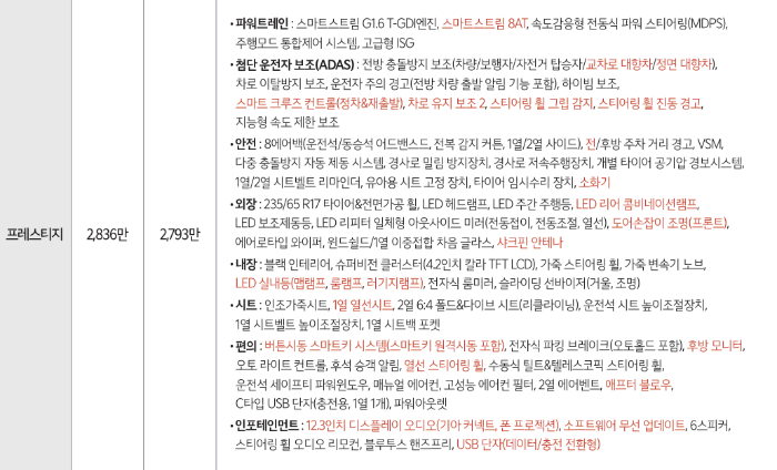 | 프레스티지 | 2,836만 원 | 2,901만 원 | 3,358만 원 |