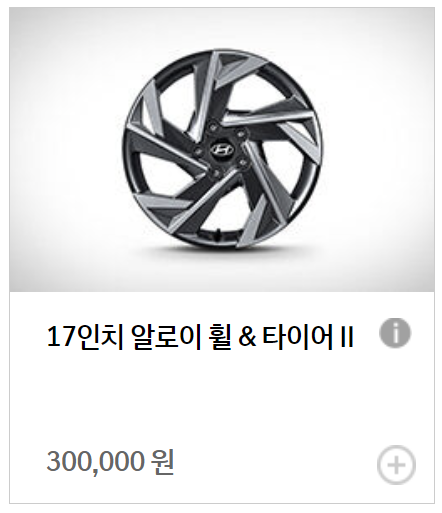 만약 30만 원 17인치 알로이 휠 & 타이어 옵션을 선택하면 16인치가 17인치로 업그레이드됩니다. 휠이 커지면 차의 외장 디자인이 멋스럽게 보입니다.
