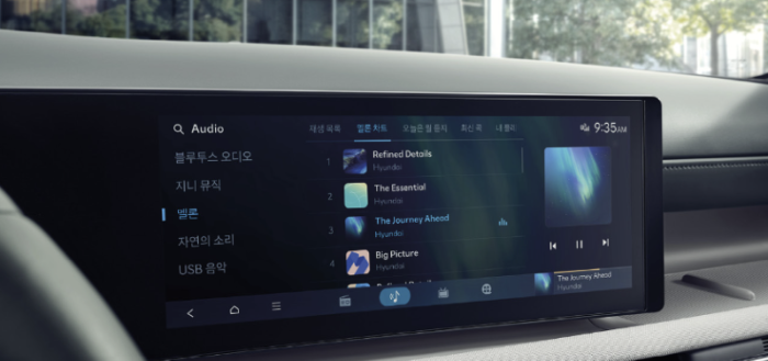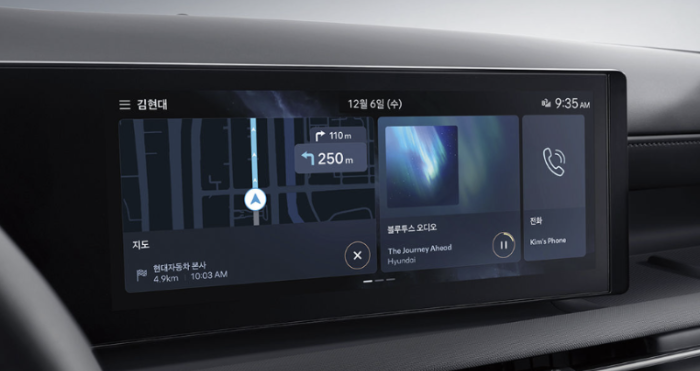 12.3인치 내비게이션은 클러스터 및 헤드업 디스플레이와 일원화된 GUI 테마가 적용됩니다. 현대의 순정 내비게이션이 적용되어 티맵, 네이버 지도, 카카오맵 등의 별도 스마트폰 애플리케이션을 사용하지 않아도 편리하게 목적지로의 주행이 가능합니다.