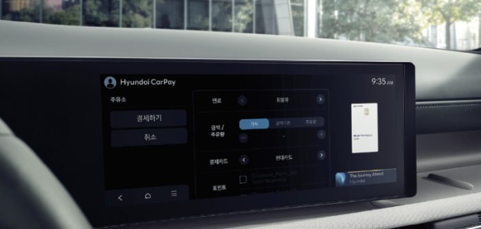 12.3인치 내비게이션을 추가하면 현대 카페이 기능을 통해 주유소 및 주차장에서 차량에서 운전자가 내리거나 카드를 지불하지 않아도 간단히 결제가 가능합니다.