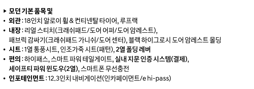 | 모던 트림 | 미적용 | 듀얼 풀오토 에어컨, 레인센서, 2열 에어벤트, 세이프티 파워 윈도우 (운전석) 기본 적용 |