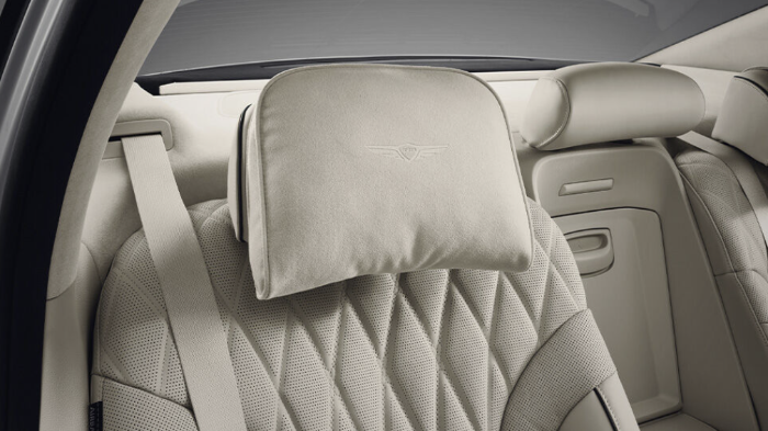Genesis G80 Black 전용 프라임 나파 가죽 시트(Black 전용 퀼팅, 파이핑 적용), 운전석 & 동승석 에르고 모션 시트(18방향, 쿠션 익스텐션, 볼스터 전동 조절 적용, 스트레칭 모드 포함), 2열 전동 및 통풍 시트, 뒷좌석 목베개