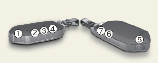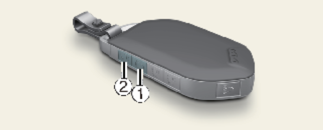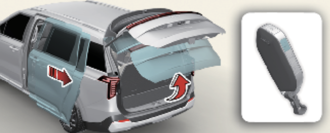 의도치 않게 스마트 파워 슬라이딩 도어가 열릴 경우 스마트키를 활용하여 간단하게 작동을 중지할 수 있습니다. 스마트 파워 테일게이트 기능이 작동하는 감지 및 경보 단계에서 위 사진의 스마트 키의 아무 버튼을 짧게 누르면 스마트 파워 테일게이트 기능이 즉시 중지됩니다.