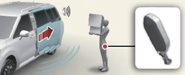 운전자가 스마트키를 휴대하고 스마트 파워 슬라이딩 도어 감지 영역 약 30~60cm 이내에 접근하면 약 3초간 비상 경고등 및 경고음이 작동합니다.