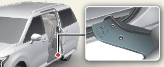 슬라이딩 도어를 열고 승하차할 때 도어의 위 사진 속의 힌지를 밟거나 무거운 물건 등을 올리거나 떨어트리지 않도록 주의하는 것이 필요합니다.