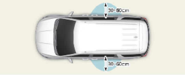 파워 슬라이딩 도어 약 30~60cm 이내에 스마트키가 감지되면 웰컴 경보가 작동하면서 기능이 작동합니다. 경보 도중 감지 영역 밖으로 벗어나면 경보는 즉시 중지됩니다.