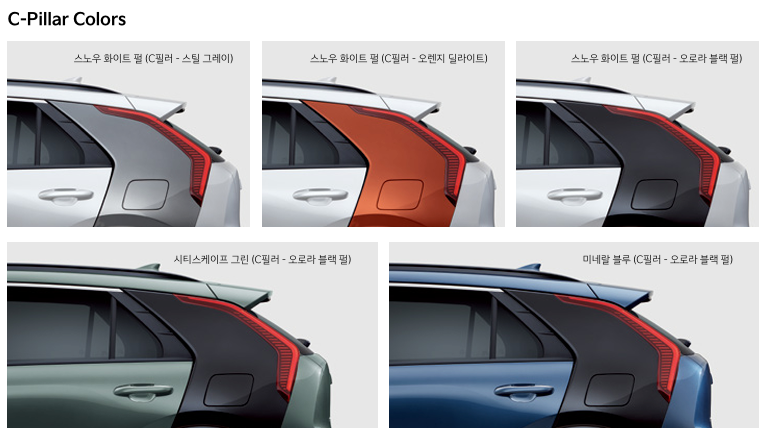 어스 트림을 선택하면 기본적으로 그레이 색상의 칼라 가니쉬가 C필러에 적용됩니다. 만약 20만 원 옵션을 추가하면 오렌지 딜라이트, 오로라 블랙 펄 중 선택이 가능합니다.