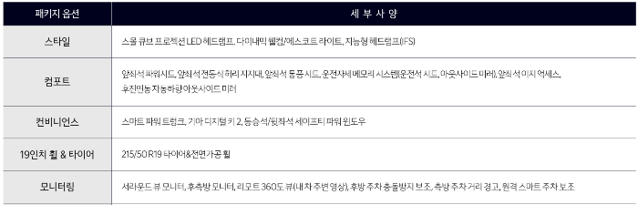 | 편의 | 후석 승객 알림(센서 타입), 인테리어 모드(휴식/감상모드) |