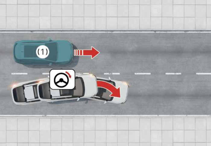차로 내 전방의 차량, 이륜차, 보행자 및 자전거 탑승자와의 충돌 위험이 판단되고 운전자가 충돌을 피하기 위해 스티어링 휠을 조작하면 조향을 도와줍니다.