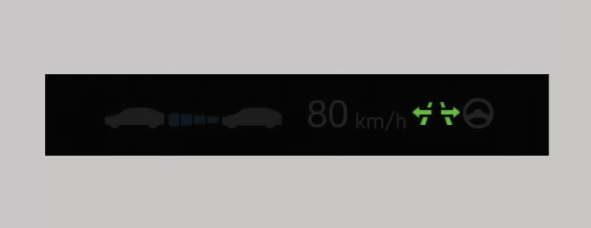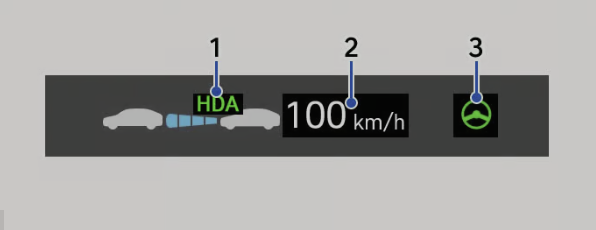 HDA가 초록색으로 표시되면 작동 중인 상태이며, 회색으로 표시되면 대기 상태가 됩니다. 흰색 깜빡임은 운전자가 가속 페달을 밟은 상태에서 표시됩니다. 또한 고속도로 주행 보조가 꺼지는 경우 글자가 표시되지 않습니다.