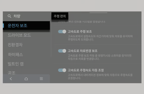 시동이 켜진 상태에서 인포테인먼트 시스템에서 설정 → 차량 → 운전자 보조 → 주행 편의를 차례로 선택하면 각 기능의 설정 여부를 설정할 수 있습니다.