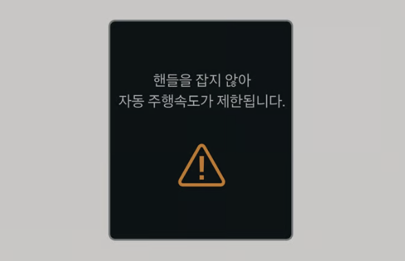 핸즈오프에 의해 고속도로 주행 보조가 꺼지면 주행속도가 제한됩니다. 주행속도 제한 기능이 작동하는 중에는 지속해서 경고문이 표시되고 경고음이 울립니다.