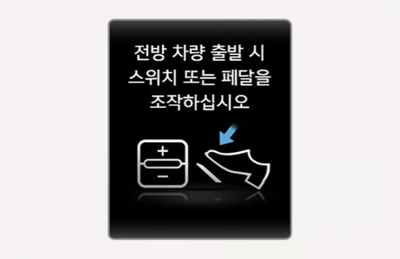 차량이 정차한 후 30초 이상이 지나면 클러스터에 '전방 차량 출발 시 스위치 또는 페달을 조작하십시오'라는 안내문이 표시됩니다. 이때 운전자가 가속 페달을 밟거나, 스티어링 휠의 +,- 스위치를 누르거나 아래위로 움직이면 차량이 출발합니다.
