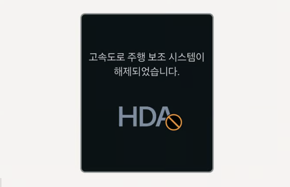 운전자가 핸즈오프 경고 이후에도 계속해서 스티어링 휠을 잡지 않으면, 경고문 '고속도로 주행 보조 시스템이 해제되었습니다.' 표시되며, 고속도로 주행 보조 기능 및 차로 유지 보조 기능이 동시에 꺼집니다.
