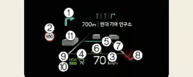 4) SCC 설정속도 표시 : 운전자가 스마트 크루즈 컨트롤 또는 고속도로 주행 보조 기능을 작동시켰을 경우 설정된 속도가 헤드업 디스플레이에 표시됩니다.