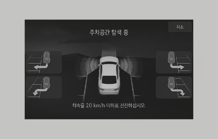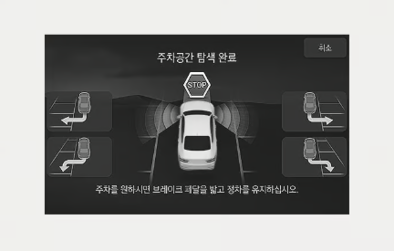 주차공간 탐색을 완료되면 운전자는 브레이크 페달을 밟아 차량을 정차한 후 인포테인먼트 시스템 화면에 표시된 주차 유형 중 선택을 가능합니다.
