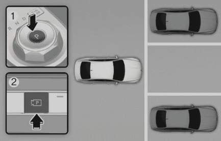 원격 전진 및 후진 기능을 사용하려는 공간 앞에 차량을 정렬한 후 운전자가 주차 P단으로 변속합니다. 실내의 ② 주차 / 뷰 버튼을 길게 누르면 원격 스마트 주차 보조 기능이 켜지고 인포테인먼트 시스템 화면에 안내문이 표시됩니다.