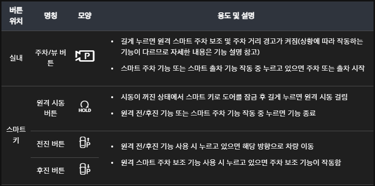 차량 내부에서는 주차 / 뷰 버튼을 이용하며, 차량 외부에서는 스마트 키를 활용하여 원격 스마트 주차 보조 2 기능을 사용할 수 있습니다.
