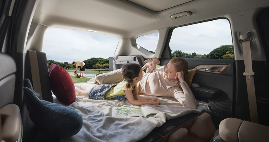 EV5는 다이브 시트가 적용됩니다. 2열 시트를 접으면 좌석이 아래쪽으로 내려가 트렁크와 2열의 평탄화가 용이하게 해줍니다. 2열 공간과 트렁크의 활용성이 높습니다. 다른 SUV 차량의 경우 차박을 위해 별도 평탄화 작업을 해줘야하지만 EV5는 평탄화 작업을 하지 않아도 된다는 큰 장점이 있습니다.