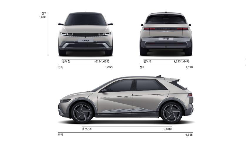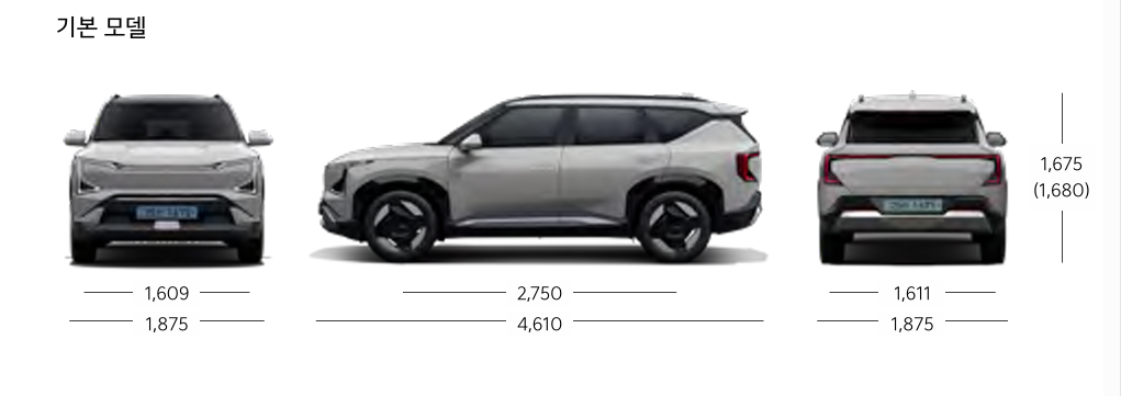 기아 EV5와 현대 아이오닉 5의 크기는 겅의 비슷합니다. EV5가 전고가 7cm 높아 공간 활용성이 더 높아 보입니다. 다만, 전폭이나 전작이 아이오닉 5에 비해 다소 작습니다.