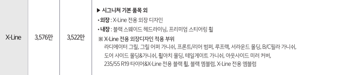 위 표를 보면 X-Line 트림은 시그니처 트림에서 64만 원을 추가하면 됩니다. 비교적 저렴한 가격으로 외장재 및 내장재가 업그레이드되는 트림입니다.