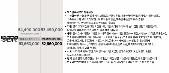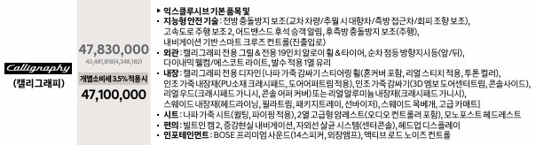 이번에 새롭게 신설된 아너스 트림 4,513만 원에서 197만 원을 추가하면 캘리그래피 트림을 4,710만 원에 구입 가능합니다. 비교적 저렴한 가격에 캘리그래피 트림 구입이 가능합니다.
