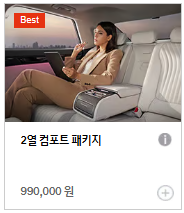 ◦ 2열 컴포트 패키지 (2열 리클라이닝/통풍, 퀼팅 천연 가죽 시트)를 선택할 수 있습니다 (990,000원).