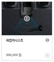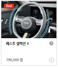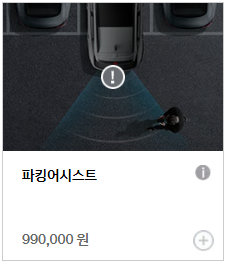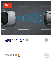 예산이 허락한다면 베스트 셀렉션 1 옵션에 추가적으로 필요한 옵션 선택을 추천합니다. 현대 스마트센스 옵션의 경우 운전 보조 기능이 적용되며, 파킹 어시스트 옵션은 주차 편의 사양이 적용됩니다.
