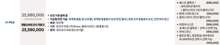 최하위 모던 트림에서 81만 원을 추가하면 다양한 사양이 기본 적용되는 H-Pick 트림 구입이 가능합니다. 때문에 가성비가 중요한 운전자라면 H-Pick 트림을 선택할 것으로 생각됩니다.
