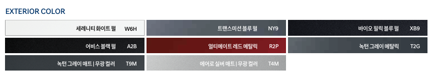 - 얼티메이트 레드 메탈릭(R2P): 강렬하고 스포티한 붉은색 메탈릭 색상. 단, 네이비 내장 컬러 선택 불가