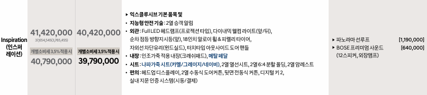 최상위 트림인 인스퍼레이션은 4,142만 원(개별소비세 3.5% 적용 시 4,079만 원)으로, 외관에서 가장 완성도 높은 사양을 자랑합니다