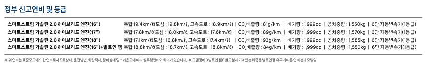 - 연비: 복합 19.4km/ℓ (도심 19.8km/ℓ, 고속도로 18.9km/ℓ)